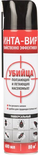 Аэрозоль универсальный Инта-вир для уничтожения в помещениях летающих и ползающих насекомых: мух, комаров, москитов, бабочек моли, ос, а также тараканов, блох, клопов, муравьев и кожеедов.