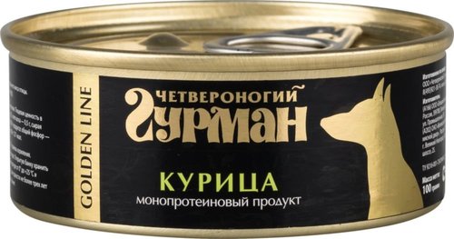 Срок годности: 1095 дней. Корм консервированный для собак ЧЕТВЕРОНОГИЙ ГУРМАН Golden line Курица для собак – это влажный рацион супер-премиум-класса, приготовленный из одного вида мяса качества Human grade. Корм полностью натуральный. В его составе нет искусственных красителей, ароматизаторов, усилителей вкуса и ГМО. Открыв баночку, вы увидите крупно нарезанное сочное филе. Golden line – это 98% настоящего мяса в натуральном ароматном желе. Подходит для собак всех пород, а также для питомцев, которым показана строгая или монобелковая диета.