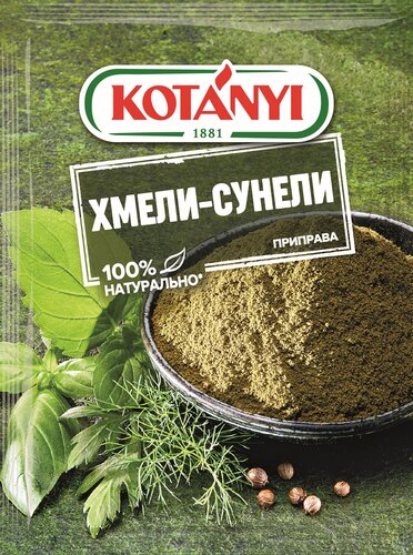 Приправа "Хмели-сунели" Kotanyi-это ароматная смесь, базилика, чабера, кориандра и зеленой мяты. Это смесь трав придаст блюдам летний, свежий аромат. Может содержать следы глютеносодержащих злаков, яиц, сои, сельдерея, молока (лактозы), горчицы