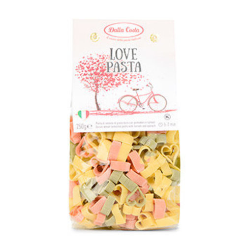 Разноцветная паста в форме сердечек. Чтобы придать макаронам яркий цвет, в тесто добавили томат и шпинат. Паста хорошо удерживает соус, ее рекомендуются подавать с неоднородными мясными и овощными соусами, а также добавлять в салаты и супы. Компания Dalla Costa - лидер по производству необычной пасты. В ее ассортименте 40 форм и 20 вкусов. Однако паста Dalla Costa не только красива и вкусна, благодаря деликатной сушке при низких температурах, в ней сохранены все полезные свойства зерна.