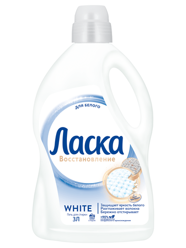 Гель для стирки Ласка Восстановление White для белого белья. Жидкий порошок Ласка Восстановление White для белого эффективно и бережно отстирывает загрязнения на одежде и белье. Формула содержит специальный оптический отбеливатель, благодаря чему средство Ласка восстанавливает и сохраняет белизну вещей, предотвращая появление серого оттенка. Активные компоненты способствуют уменьшению количества катышков на ткани и сохраняют прочность волокон ткани. В результате регулярного использования средства для стирки Ласка поверхность ткани становится более гладкой. Гель Ласка удобен в использовании: дозируйте жидкое средство согласно инструкции, заливайте его в отделение для стирального порошка или добавьте мерный колпачок со средством для стирки в барабан стиральной машины.
