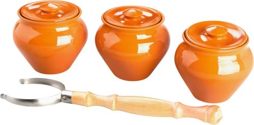 Керамический набор. Включает в себя: три горшка с крышкой и один ухват.