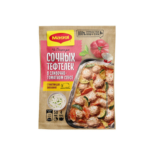 MAGGI На второе для Сочных тефтелек в сливочно-томатном соусе поможет легко и быстро приготовить любимое блюдо для всей семьи! Запеченные в специальном пакете без дополнительного добавления масла тефтельки получаются необычайно сочными и вкусными, а умело-подобранная композиция из овощей, душистых трав и пряных специй поможет раскрыть вкус и аромат вашего блюда. В новом большом пакете для запекания вы можете готовить любимые тефтельки сразу с гарниром - свежими овощами по сезону или крупами, и каждый раз создавать сбалансированное и вкусное блюдо.