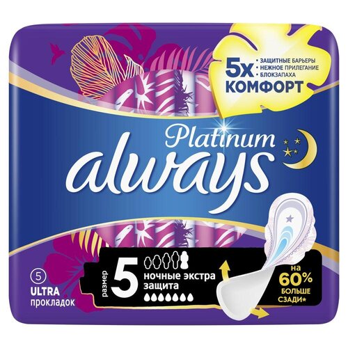 Гигиенические прокладки Always Platinum обеспечивают лучшее сочетание комфорта и защиты среди прокладок Always. Always Platinum более комфортны (по сравнению с Always Ultra) благодаря тысячам микроподушечек и новым, мягким как шелк крылышкам. Они также обеспечивают лучшую защиту (по сравнению с Always Ultra) благодаря защитным боковым барьерам и ультравпитывающему внутреннему слою, который запирает влагу внутри. Always Platinum Secure Night (Размер 5) с крылышками рекомендованы для ночного использования, благодаря удлиненной на 60% задней части (по сравнению с Always Platinum Размер 2). Попробуйте Always Platinum Long (Размер 2) для дневного использования при умеренных выделениях.
