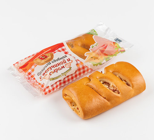 Мука пшеничная хлебопекарная высшего сортаначинка (ветчина: свинина, вода питьевая, крахмал картофельный, соль пищевая, сахар, пряности, регуляторы кислотности: Е450, Е451; ароматизатизатор, усилитель вкуса и аромата Е621, антиокислитель Е301, стабилизаторы: Е407а, Е452, фиксатор окраски Е250; сыр плавленый (сыры жирные, сыр нежирный, крахмал кукурузный, сыворотка молочная сухая, творог, сливки, вода питьевая, пищевые добавки: соль пищевая, эмульгирующая соль, фосфатная добавка: «фонакон», ароматизатор «сыр Голландский», краситель - бета каротин, консервант сорбат калия; меланж), вода питьевая, маргарин (рафинированные дезодорированные растительные масла в натуральном и модифицированном виде (подсолнечное, пальмовое), вода питьевая, эмульгаторы Е471, Е475; соль пищевая, ароматизатор, краситель Е160а, регулятор кислотности: лимонная кислота), сахар, дрожжи прессованные хлебопекарные, меланж, соль пищевая.