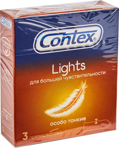 Презервативы Сontex® "Lights" 3 шт. - гладкие, тонкие. 3 особо тонких презервативов Contex Lights (Лайтс) в силиконовой смазке для большей чувствительности. Бесцветные, прямой формы, с накопителем. Номинальные размеры: длина – 180 мм, ширина – 52 мм. Смазка не разрушает сперматозоиды. Изготовлены из натурального латекса. Проверено электроникой. Только для одноразового использования. Хранить в сухом месте при температуре от 0 до 25°С вдали от прямых солнечных лучей.