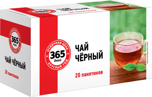 Чай черный байховый индийский в пакетиках 20*2г ТМ 365 дней.Терпкий сочный вкус, нежный аромат и сильный тонизирующий эффект.