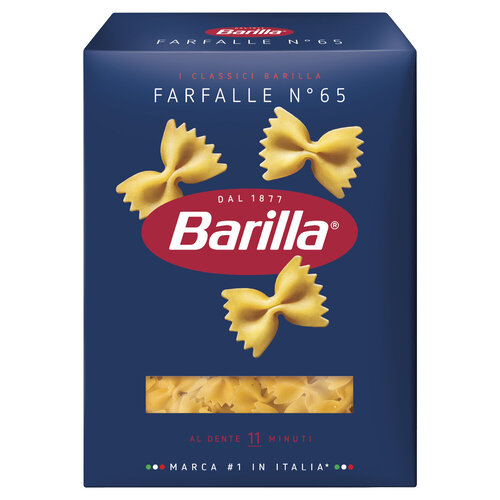 Barilla Farfalle №65 – восхитительная паста, форма которой так популярна в Италии. Главная отличительная особенность – необычный внешний вид, за который эти макароны ещё называют бабочками или бантиками. Чуть более плотная серединка и тонкие края – интересная структура для кулинарных экспериментов. Традиционно макароны-бабочки подают с рыбой, морепродуктами и лёгкими овощными или масляными соусами, однако они также отлично сочетаются с мясом, птицей и грибами. Barilla "Фарфалле" №65 производятся из муки твёрдых сортов пшеницы высшего качества и воды. До состояния аль денте они готовятся за 11 минут, не развариваются и не теряют форму.