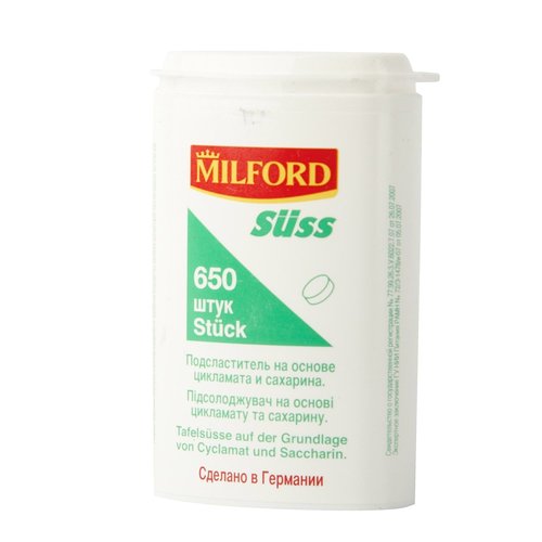 Милфорд Зюсс предназначен для употребления при диетическом питании с пониженным содержанием калорий и при сахарном диабете, а также для желающих похудеть. 1 таблетка Милфорд Зюсс содержит 40 мг сахарозаменителя цикламата, 4 мг сахарозаменителя сахарина.