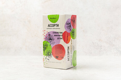Спокойствие - Баланс. Состав: мята перечнаямята курчаваямелиссашиповникромашкадушицасмородинагибискуссладкая ежевика. Имбирная энергия. Состав: имбирьапельсиновая цедралимонная трава. Детокс - молодость. Состав: ромашкамята курчаваяапельсиновая цедрамелиссафенхельлист сенныкрапива. Заряд витаминов. Состав: шиповникапельсиновая цедрамятадушицалимонная травасмородинагибискуссладкая ежевика.