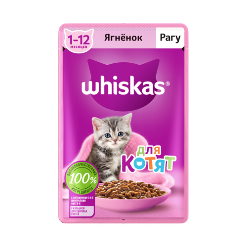 Рацион Whiskas® для котят "Рагу с ягненком" - это сбалансированный рацион для здорового роста вашего малыша. Котенок с удовольствием попробует маленькие нежные кусочки с ягненком в ароматном соусе. Все для замурррчательной жизни! Рационы Whiskas® для котят позаботятся об иммунитете, поддержат здоровое пищеварение и обеспечат здоровый рост и развитие. Котята активно растут и с первых дней нуждаются в правильном питании. Корм Whiskas® для котят создан с учетом всех особенностей развития организма котенка. • Для здорового роста и правильного развития корм Whiskas® для котят содержит оптимальное сочетание питательных веществ, витаминов и минералов. Содержит: • 100% натуральные высококачественные ингредиенты: мясо и субпродукты - без добавления ароматизаторов, искусственных красителей и консервантов. • Кальций для здоровья костей. • Омега-6 и цинк для здоровья кожи и шерсти. • Витамин А и таурин для хорошего зрения. • Витамины D, E и минералы. Ваш котенок будет мурчать от удовольствия!