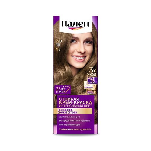 Благодаря тройной системе ухода стойкая крем-краска для волос Палетт обеспечивает бережное окрашивание. С аммиаком. Комплекс с Кератином, Пантенолом и Аргановым маслом проникает глубоко в структуру волоса, восстанавливая, увлажняя и питая его изнутри. Активные вещества оказывают смягчающее и укрепляющее воздействие, делая волосы гладкими и блестящими.