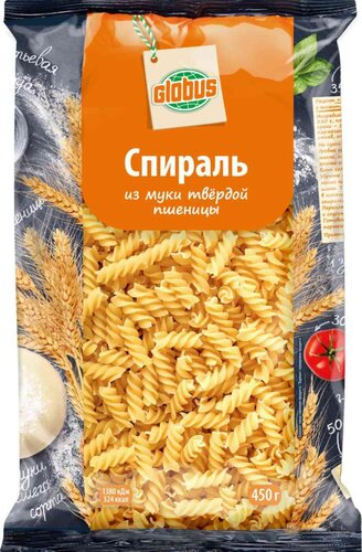 ГлавнаяБакалеяМакароныМакаронные изделия спираль из муки твёрдой пшеницы ТМ Глобус Макаронные изделия спираль из муки твёрдой пшеницы ТМ Глобус