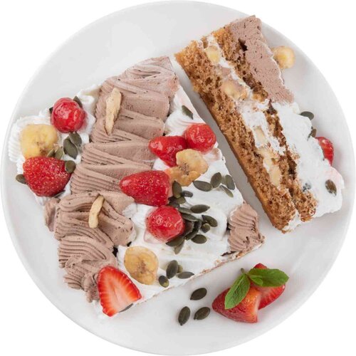 Крем на растительных маслах "Амбианте" (вода питьевая, жир растительный пальмоядровый, сахар, эмульгаторы (Е420ii, E435, E472e, E491, E322, E322, E481), стабилизаторы (E466, E464, E412, E407, E331iii, E339ii), ароматизатор, соль, краситель - бета-каротин)мука пшеничная высшего сортабанансахар-песокнектар яблочный (яблочный сок, яблочное пюре, сахар, вода питьевая)клубникамасло подсолнечноегрецкий орехморковьглазурь (сироп глюкозный, сахар, вода питьевая, загустители (агар, пектин), регулятор кислотности - кислота лимонная, консервант - сорбат калия, эмульгатор Е452i)комплексная пищевая добавка (крахмал, разрыхляющий агент Е500ii, Е450i)цукаты из банана (бананы сушёные, сахар, кокосовое масло)какао-порошоксемечки тыквенные (ядро)сольванилин.