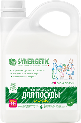 Концентрированный антибактериальный гель для посуды Synergetic - это экологичное, безопасное и эффективное средство для мытья посуды, фруктов и овощей. Гель полностью смывается водой и подходит для мытья детской посуды, сосок, бутылочек и игрушек. Устраняет жир и запахи с посуды даже в холодной воде благодаря синергетическому сочетанию компонентов. Мягкие биоразлагаемые тензиды, полученные из растительного масла, удаляют органические загрязнения с посуды и обеспечивают хорошее пенообразование, не вызывая раздражения кожи рук. Гель для посуды содержит гипоаллергенные отдушки на основе эфирных масел и безопасные пищевые красители, поэтому подходит даже для людей с чувствительной кожей рук. Натуральный растительный глицерин в составе геля защищает кожу рук от сухости и раздражения и обеспечивает антисептический эффект, благодаря антибактериальной активности. Аппликационные тесты, проведенные международным агентством ICEA, подтверждают отсутствие раздражающего эффекта на кожу человека. Гель для посуды Synergetic сертифицирован в Итальянском институте этической и экологической сертификации ICEA и имеет международный сертификат, подтверждающий биоразлагаемость, безопасность и эффективность средства на уровне лидеров европейского рынка бытовой химии. Биоразлагаемый гель для посуды не вредит микрофлоре септических установок. Попадая в среду септика, средство "понятно" для микроорганизмов и без труда распадается на простые соединения. Synergetic проводит внутренние испытания средств без использования лабораторных животных. Оценку токсичности мы проводим методом IN VITRO на биомассе. Наша компания разделяет позицию "Мир без жестокости" и занимается общественной деятельностью по корректировке существующих стандартов и разрешению использования этого метода для регистрации продуктов моющих средств. Флакон выполнен из полиэтилена и имеет код переработки 02. Мы рекомендуем сортировать пустую тару и участвовать в акции Synergetic "ЭкоМобиль" - сдавать пустую тару и получать бонусы на покупку продукции Synergetic. Дозатор имеет сложную конструкцию из разных материалов и не подлежит переработке в собранном виде. При желании дозатор можно разобрать на составляющие части и отдельно сдать в переработку отходов соответствующего класса.