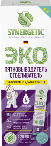 Биоразлагаемый гипоаллергенный отбеливатель-пятновыводитель с активным кислородом Synergetic в стиках - универсальное средство для эффективного удаления загрязнений и трудновыводимых пятен от масла, жира, какао, ягод, травы, чернил, кофе, вина, крови и др. на цветном и белом белье из натуральных и синтетических тканей. Сохраняет цвет и бережно относится к тканям. Подходит для предварительной обработки пятен, замачивания белья, ручной и машинной стирки. Может использоваться как усилитель моющих средств и отбеливатель в автоматических стиральных машинах всех типов. Гипоаллергенный пятновыводитель подходит для детского белья и одежды людей с чувствительной кожей. Полностью выполаскивается из волокон ткани и не остается на одежде. Комбинация пяти видов энзимов (протеаза, амилаза, целлюлаза, липаза, маннаназа), растительных ПАВ и активного кислорода эффективно удаляет застарелые пятна с волокон ткани даже в холодной воде и при коротких циклах стирки.