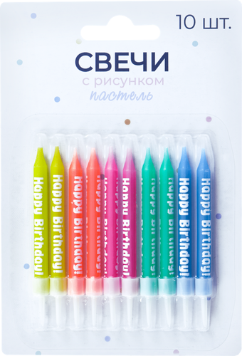 Набор парафиновых свечей для торта с рисунком. Всего в комплекте 10 свечей. Также в наборе есть специальные подставки для того, чтобы воткнуть свечи в торт. Такой аксессуар сделает вашу вечеринку еще ярче и праздничнее.