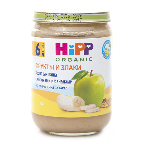 Каша "Зерновая с яблоками и бананами" для детского питания с 6 месяцев. Пюре из смеси яблок и бананов с зерновыми компонентами, обогащенное витамином С. Хранить при температуре от +2 до +25С. Открытую бутылку хранить закрытой в холодильнике не более 2-х суток.