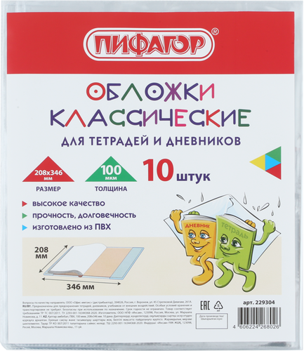 Обложки для тетрадей и дневников от бренда Пифагор 20,8х34,6 см 100 мкм ПВХ надежно защитят книги и тетради. Стильные аксессуары отличаются прочностью и привлекательным дизайном. Они прослужат на протяжении длительного срока без разрывов и повреждений. В набор входит 10 обложек.