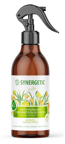 Биоразлагаемый освежитель воздуха, нейтрализатор запахов synergetic имбирь и лемонграсс на водной основе на 98, 2% состоит из натуральных компонентов. Парфюмерная композиция с эфирными маслами имбиря, бергамота и лемонграсса наполняет воздух ярким цитрусовым ароматом. Гипоаллергенная формула безопасна для людей и животных. Благодаря 100% натуральному поглотителю запахов соли полиитаконовой кислоты освежитель эффективно устраняет стойкие запахи от приготовления пищи, домашних животных, табака и других источников неприятных запахов в гостиной, ванной комнате и санузле, спальне, коридоре, кухне, автомобиле, офисе и прочих помещениях. Подходит для устранения неприятных запахов с тканей (диванов, подушек, ковров, занавесок, простыней, тканевых автокресел, постельного белья), занавесок для душа и спортивных ковриков. Не оставляет следов на поверхностях, увлажняет воздух в помещении и способствует осаждению пыли. Не содержит парабенов, фреонов, газов-пропеллентов, фталатов и красителей.