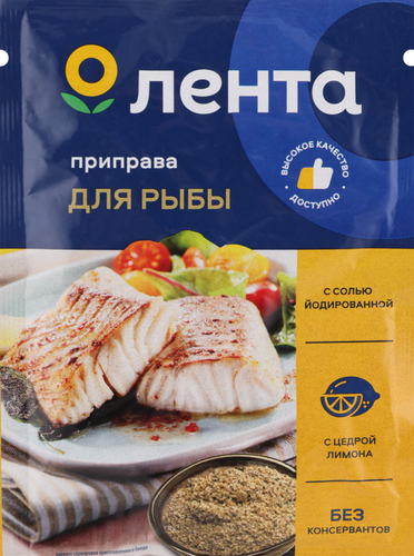 Приправа для рыбы лента составлена из взятых в тщательно выверенной пропорции отборных ингредиентов. В состав смеси входит йодированная соль, лук, зерна горчицы, базилик, укроп и другие продукты. Использовать такую приправу можно как для жарки, тушения и запекания рыбы, так и добавлять ее в различные маринады.