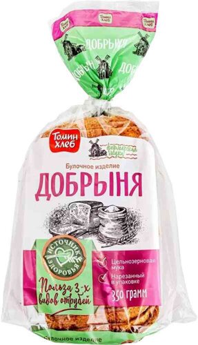 "Добрыня" - источник здоровья от бренда "томин хлеб". Цельнозерновая мука увеличивает время усвоения, позволяя дольше сохранять чувство насыщения, а 3 вида отрубей и семена льна в составе способствуют улучшению пищеварительного процесса. Такой хлеб сохраняет насыщенность вкуса и мягкость пшеничного хлеба, но при этом менее калориен, чем обычный белый.