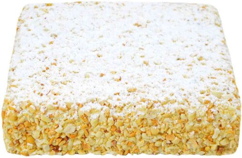 Нежные слои бисквита, соединённые сливочным кремом. Поверхность торта покрыта сливочным кремом, обсыпана ядром дробленного арахиса и сахарной пудрой.