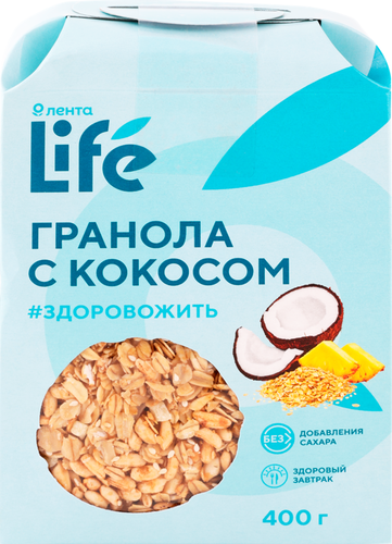 Гранола лента life с кокосом поможет пополнить запасы сил и энергии и внесет приятное разнообразие в привычное меню. Употреблять такой продукт можно не только в качестве завтрака, но и как десерт или полезный перекус в течение дня. В его состав входят запеченные мюсли без добавления сахара, красителей и консервантов.