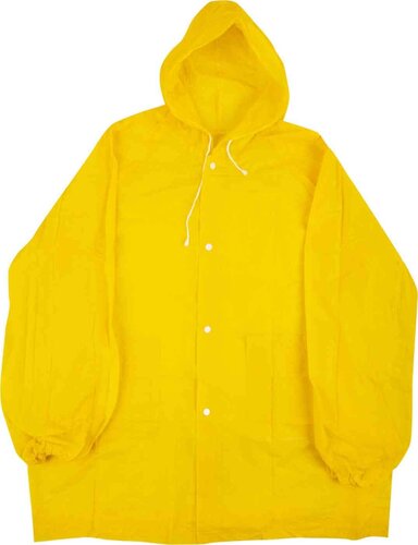 Дождевик для взрослых; пластиковая застежка спереди; шнурок на капюшоне; материал: 100% пвх; цвет: желтый; размер: xl; толщина 0,10 мм; длина: 75 см; ½ груди: 70 см; длина рукава: 68 см.
