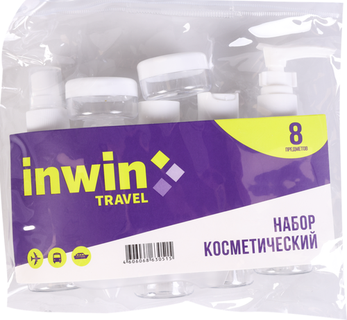 Набор косметический inwin travel включает в себя несколько емкостей для хранения кремов, лосьонов, жидкого мыла, шампуня и других косметических средств. В него входит: бутылочка с дозатором объемом 50мл, бутылочка с пульверизатором объемом 50мл, две бутылочки с крышкой диск-топ объемом 50мл, бутылочка для шампуня/бальзама для волос объемом 30мл, две баночки с закручивающейся крышкой объемом 10мл, лопатка косметическая.