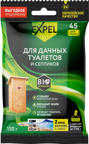 Биоактиватор для дачных туалетов и септиков expel содержит концентрированные культуры бактерий, которые разлагают фекальные массы на воду, углекислый газ и соли. Благодаря наличию в составе энзимов средство начинает работать сразу после внесения.