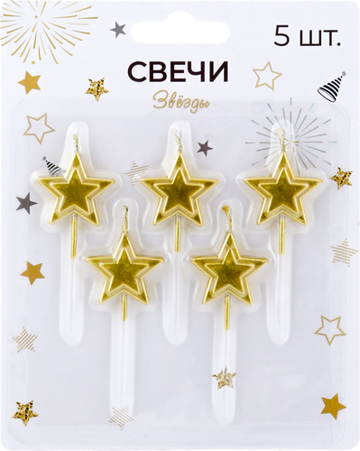 Набор свечей для торта в виде блестящих звезд. Удобно вставляются в торт благодаря специальным устойчивым подножкам. Такой симпатичный аксессуар сделает вашу вечеринку еще наряднее и добавит ее гостям праздничного настроения.