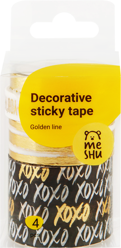 Декоративные клейкие ленты meshu предназначены для упаковки подарков, оформления поделок, элементов интерьера и скрапбукинга. Открытки, альбомы, ежедневники, подставки, цветочные горшки, подсвечники, рамки и много другое может преобразиться с декоративными лентами meshu. Яркие и современные дизайны сделают процесс творчества увлекательным, а результат впечатляющим. А качественная клеевая основа позволит надёжно зафиксировать ленту и быть уверенным в долговечности декора. • ширина ленты: 30 мм, 15мм, 10 мм, 7мм; • длина намотки: 3000 мм; • материал: бумага; • количество в наборе: 4.