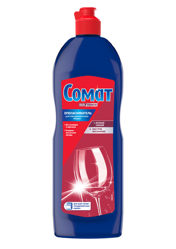 Ополаскиватель для посудомоечной машины сомат дает 5 ценных преимуществ: - придает посуде сияющий блеск. Не имеет значения, из какого материала она сделана. Стекло, фаянс, пищевая сталь, силиконовые покрытия - с ополаскивателем сомат посуда будет сиять чистотой. - ускоряет высыхание посуды. Зачастую она медленно сохнет, отнимает тем самым ценное время. Со средством сомат посуда сохнет в разы быстрее, что экономит время и избавляет от лишней влажности. - предотвращает появление разводов. Используйте средство, чтобы на посуде не появлялись пятна и разводы. Вся кухонная утварь будет выглядеть безупречно. - предотвращает появление известкового налета на деталях посудомоечной машины. Благодаря эффективным пав в составе средства, сомат позаботится о том, чтобы посудомоечная машина служила долго, не накапливала известковый налет и не доставляла лишних хлопот с дорогостоящим ремонтом. - обеспечивает максимальную чистоту посуды и посудомоечной машины в сочетании с таблетками сомат. Таблетки сомат расщепляют остатки пищи и удаляют сложные загрязнения, обеспечивая превосходный результат. Пользуйтесь средствами для посудомоечной машины сомат, чтобы посуда сверкала чистотой, а техника служила долго и надежно!