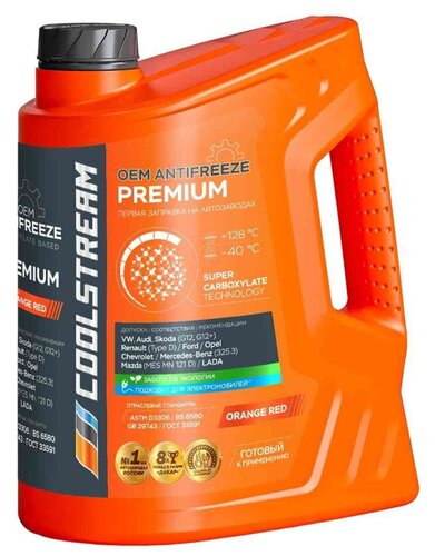 Coolstream premium - флагманский карбоксилатный антифриз в линейке coolstream (super-oat). Поставляется на автозаводы для конвейерной заправки и для сервисного обслуживания. Имеет максимальный уровень защитных свойств, что дает возможность увеличить межсервисные пробеги и избежать дорогостоящих ремонтов техники. Содержит первичный этиленгликоль высшего сорта, деминерализованную воду и сбалансированный пакет органических ингибиторов (эффективная защита от коррозии металлов и сплавов, не оказывает негативного воздействия на резиновые и пластиковые компоненты системы охлаждения). Не вспенивается, не образует накипи и канцерогенных соединений в процессе эксплуатации. Обеспечивает устойчивую работу системы охлаждения при рабочих температурах от -40 °с до +128 °c соответствует требованиям - vw, audi, skoda, seat, tl 774-d (g12), tl 774-f (g12+), gm chevrolet, opel gmw 3420, gm 6277m, ford wss-m97b44-d и др.