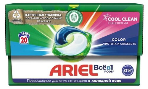 Капсулы для стирки ariel color 20 штук подходят для стирки цветного и белого белья. Благодаря уникальному многосекционному дизайну, превосходное очищение еще никогда не было удобнее. Каждая капсула содержит комплекс мощных активных ингредиентов для эффективного отстирывания. Все компоненты уже дозированы в оптимальной пропорции в 100% водорастворимой пленке. Достаточно лишь добавить капсулу в барабан стиральной машины до загрузки белья. Ariel капсулы содержат высокую концентрацию очищающих веществ: одной капсулы хватит для стирки 4-5 кг белья для стирки того же количества потребовалось бы 65 мл геля для стирки ariel. Преимущества жидкого средства для стирки ariel: прекрасно отстирывает сложные пятна даже при температуре 20c; невероятная чистота в одной капсуле для стирки; обеспечивает безупречное отстирывание и яркость цвета; превосходная чистота даже при 20c; простота использования: не нужно отмерять и наливать; не содержит фосфатов и хлорных отбеливателей.