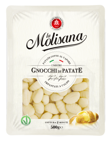 Картофельные ньокки La Molisana клёцки мелкие 500г.Картофельные ньокки являются типичным блюдом итальянской кулинарии. Ньокки восхитительны с любым соусом, будь это просто растопленное сливочное масло с шалфеем и пармезаном, сыром горгонзола или песто генуэзский. Способ приготовления: поместить клецки в кипящую подсоленную воду. Когда они всплывут слить воду и приправить желаемым соусом.