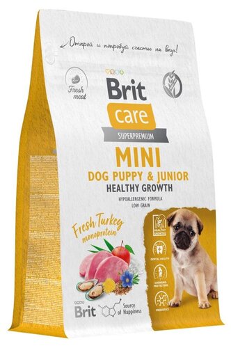 Brit Care Superpremium Mini Dog Puppy & Junior. Healthy Growth. Fresh Turkey Monoprotein. Полнорационный сухой корм суперпремиум-класса со свежей индейкой для щенков и молодых собак (1-10 месяцев) мини-пород пород (до 10 кг). Здоровый рост и развитие. Монопротеин. Подходит для беременных и кормящих собак.