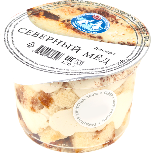Пирожное Северный мед от торговой марки СЕВЕР – классический десерт из оригинального бисквитного теста. Он буквально тает во рту и великолепно сочетается с несладким кофе и чаем. Отличное дополнение к завтраку. Традиционное в меру сладкое угощение со сливочным сыром, медом и темным шоколадом никого не оставит равнодушным.