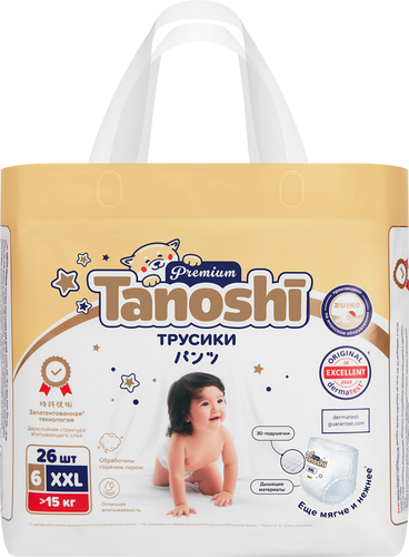 Подгузники детские TANOSHI Premium мягкие и тонкие XXL 15кг+. Комфортные и безопасные для кожи малыша, они превосходно впитывают по всей длине и не протекают, имеют анатомическую Q-форму и не ограничивают движений малыша. Произведенные из нежного и эластичного нетканого волокна на японском оборудовании Zuiko подгузники мягкие, дышащие, удобные. Обрабатываются горячим паром. Благодаря запатентованной двухслойной структуре впитывающего слоя мгновенно впитывают большое количество жидкости и надежно удерживают ее внутри, не создавая комка между ножек. А дополнительные резиночки по краям внутреннего впитывающего слоя усиливают защиту от протекания. Крепление резиночек без клея и ультразвуковая герметизация боковых швов увеличивает эластичность и мягкость трусиков. Кожа малыша надежно защищена от опрелостей, раздражения и «парникового эффекта» без присыпок и детского крема под подгузник. Цветной индикатор наполнения подскажет, когда трусики пора сменить на новые. А лента утилизации позволит аккуратно свернуть использованные трусики. Подходят для мальчиков и для девочек. Гипоаллергенны, не содержат отдушек и пропиток.