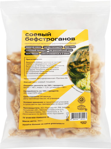 Бефстроганов соевый GREENWISE Протекс-М, из текстурированной соевой муки – текстурированный соевый белок в форме плотных брусочков. Такой продукт идеально подойдет для приготовления одноименного блюда в качестве замены мяса. Он широко известен как «соевое мясо». Соевый бефстроганов легко готовить: достаточно замочить продукт в очень горячем, насыщенном специями бульоне на 10 минут и хорошо отжать. Затем нужно обжарить соевые кусочки до золотистой корочки, подать с гарниром или запечь с любимыми соусами. При приготовлении продукт увеличивается минимум в 2 раза. Соевый бефстроганов произведен из российской сои и не содержит ГМО. Подходит для веганов. Кошерный и халяльный продукт.