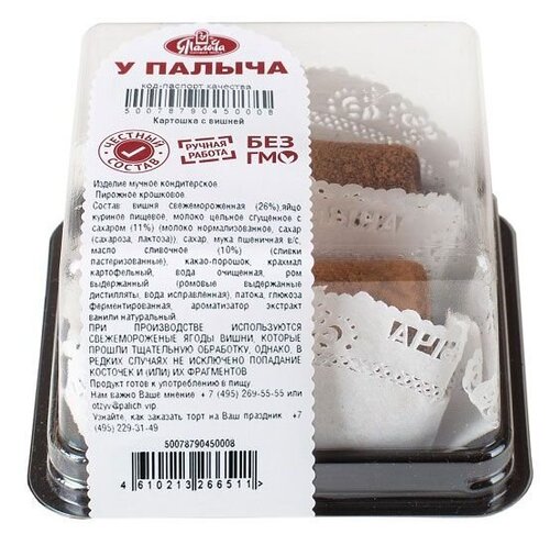 Сахарвишня свежемороженая (24%)яйцо куриное пищевоемука пшеничная в/смолоко цельное сгущенное с сахаром (молоко нормализованное, сахар (сахароза, лактоза), масло сливочное (сливки пастеризованные), какао-масло, вода очищенная, какао-порошок, сметана, крахмал картофельный, крахмал пшеничный, ароматизатор вишня натуральный, сыворотка молочная сухая, сухое обезжиренное молоко, патока, ром выдержанный (ромовые выдержанные дистилляты, вода исправленная), молоко сухое цельное, разрыхлитель сода пищевая (гидрокарбонат натрия), эмульгатор соевый лецитин, соль, глюкоза ферментированная, ароматизатор экстракт ванили натуральный, краситель оксид железа.