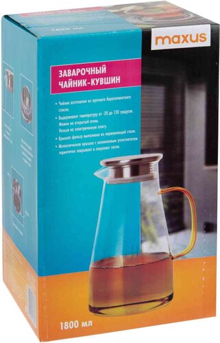 Чайник изготовлен из прочного боросиликатного стекла. Выдерживает температуру от -20°C до 130°C, его можно ставить на открытый огонь. Металлическая крышка с силиконовым уплотнителем плотно закрывает чайник и сохраняет тепло. Крышка-фильтр выполнена из нержавеющей стали. Размер: 15,2×10,6×23,2 см.