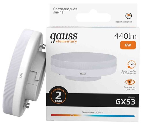 Лампа Gauss Elementary GX53 это решение для использования в натяжных и подвесных потолках домашних и коммерческих помещений. Обеспечивает относительно яркий и равномерный свет, без пульсаций, с температурой 3000К, дающий комфортное ощущение начала хорошего дня.