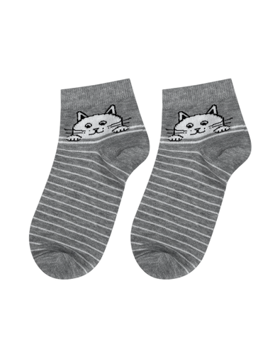 Носки женские Inwin с рисунком кот выполнены в цвете серый меланж с белыми полосками. Они изготовлены из высококачественного гребенного хлопка с добавлением небольшого количества полиэстера и эластана. Такой материал обладает более гладкой структурой, повышенной прочностью и дарит ощущение комфорта.