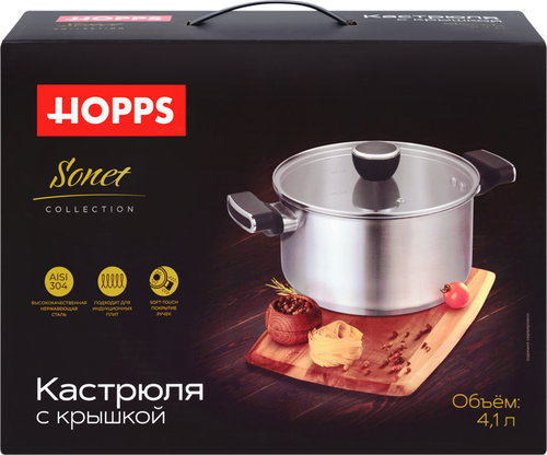 Кастрюля Sonet, ручки soft-touch, нержавеющая сталь, 4.1 л, от торговой марки Hopps – изделие из высококлассной нержавеющей стали. Можно использовать на газовых, электрических, стеклокерамических плитах. Благодаря высокой теплопроводности в кастрюле готовить можно на низкой мощности плиты, что позволяет снизить затраты на электроэнергию.